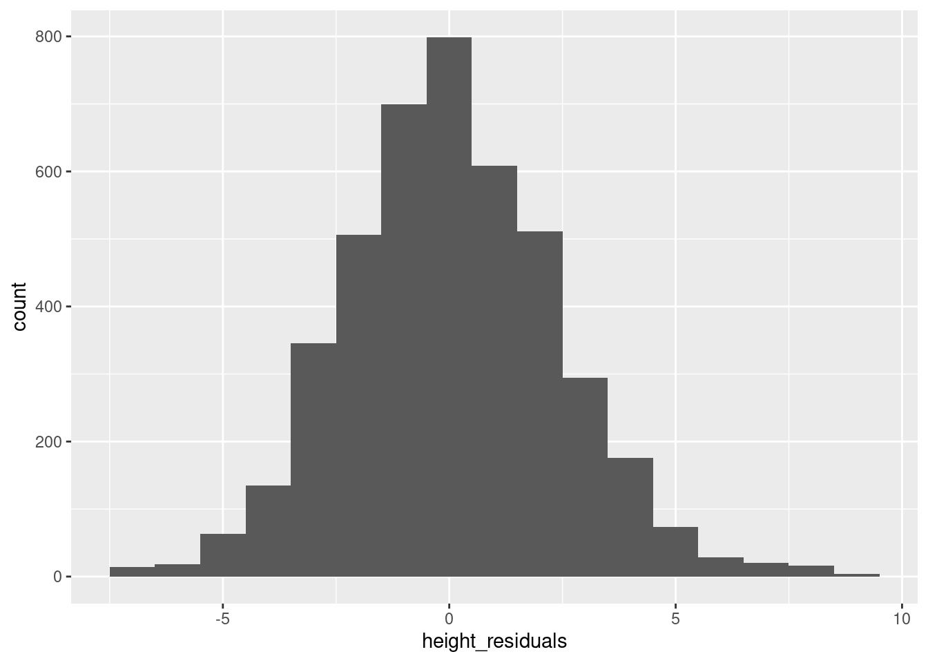 height_residuals <- residuals(height_model)What you get is just a vector of numbers that is in the order of the data that was used to fit the model. Easy. This function works for other kinds of models in R as well, if it’s been implemented by the designers of those model objects.