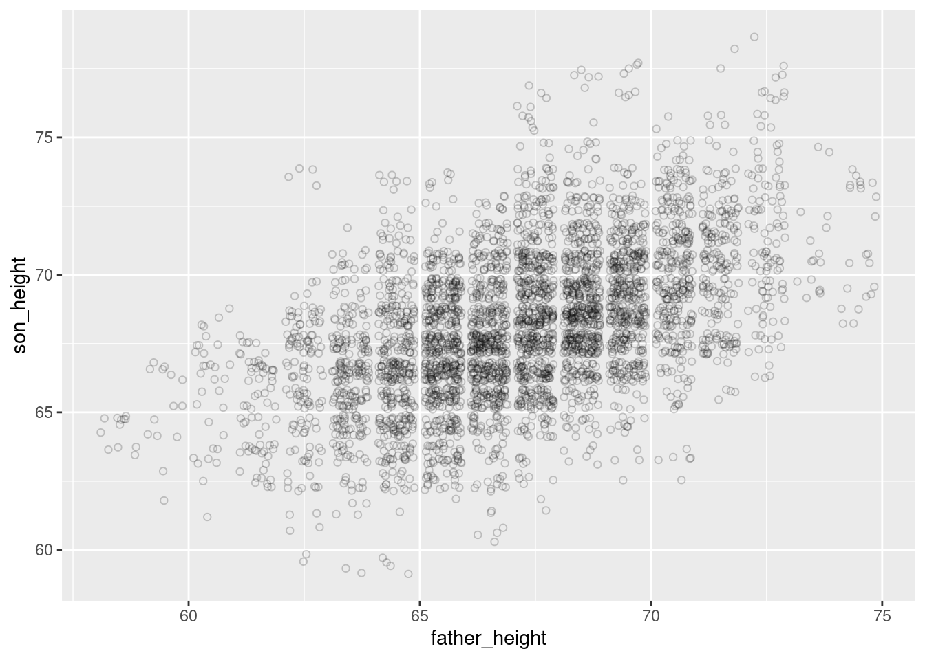 ggplot(pl, aes(father_height, son_height)) + geom_jitter(shape = 1, alpha = .2) +