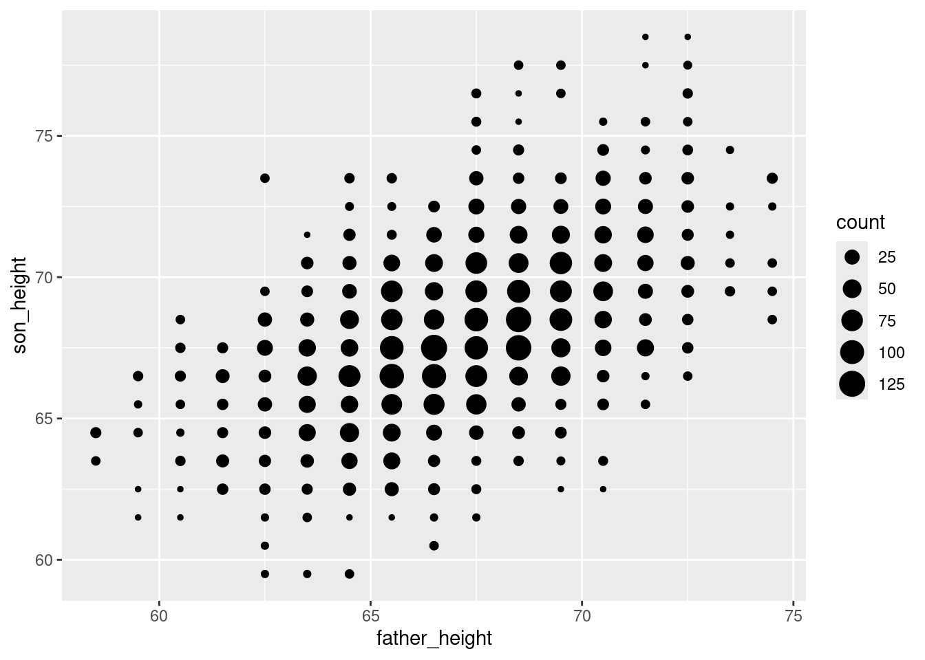So why did we go through the above aggregation? Well now we have a data frame that not only has the \(x\)’s and \(y\)’s we want to plot (father_height and son_height for x and y coordinates), but we have a new column that tells us how many values are at each of those coordinates. And when you have columns in your data, you can map those to graphical properties in ggplot!