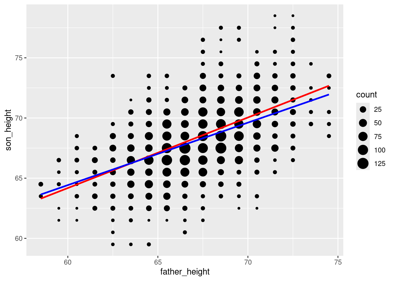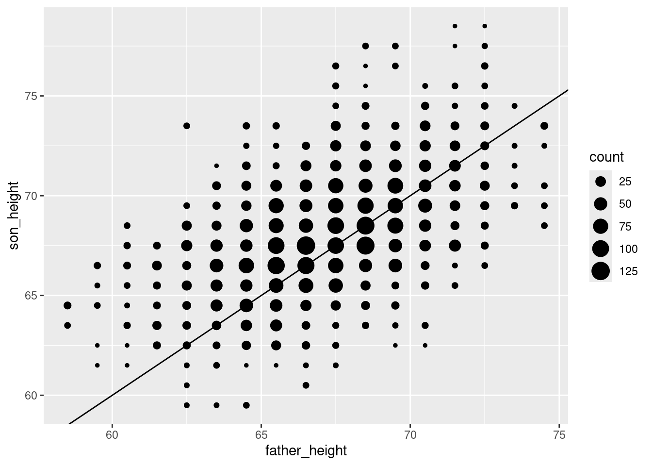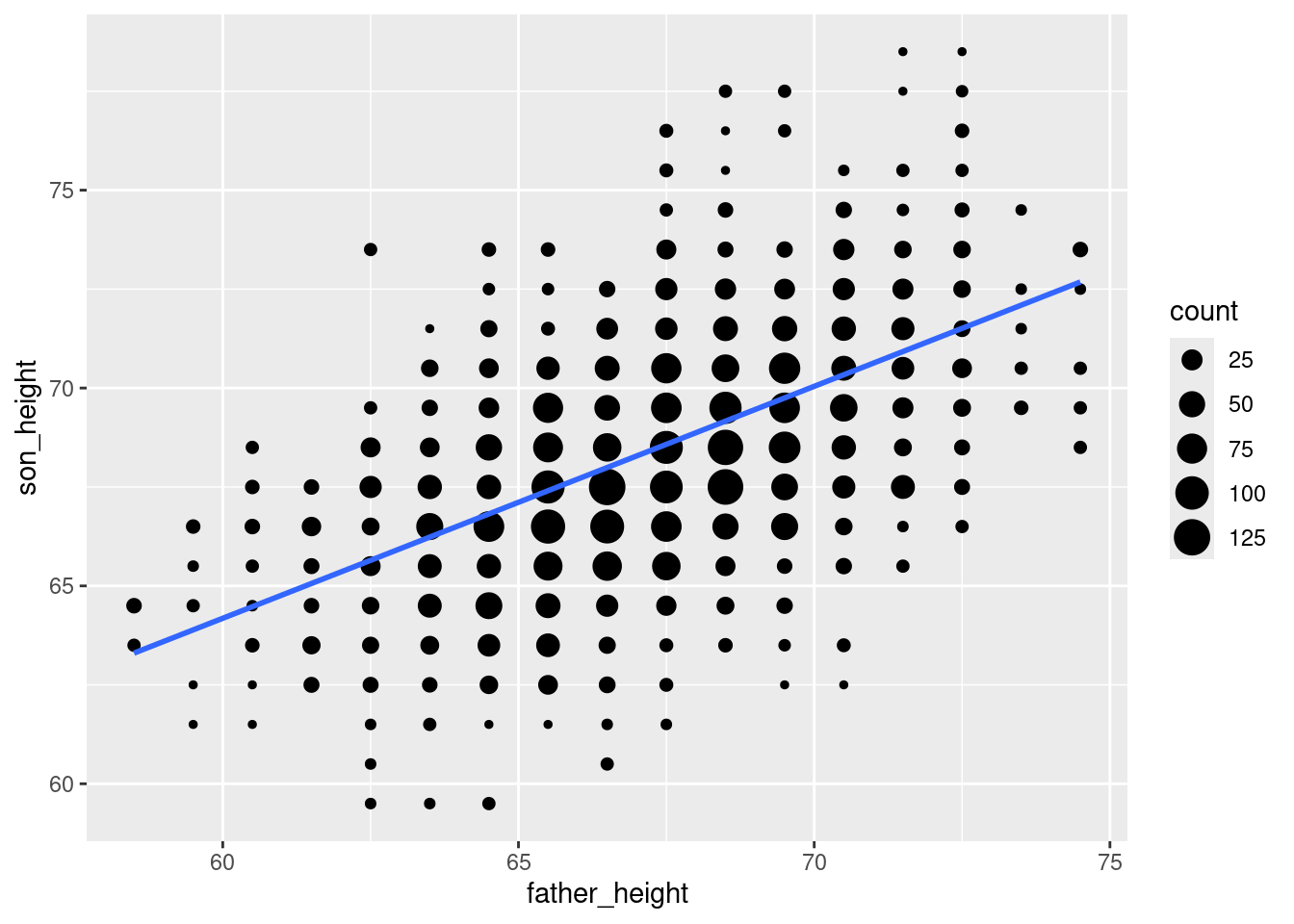 In this case, we can use the property of the size of the points we’re plotting to reflect the count of how many father-son pairs are represented with that point. In the ggplot2 package, every time we want to map something in our data to a graphical property, we need to use the aes() function. The code looks like this”