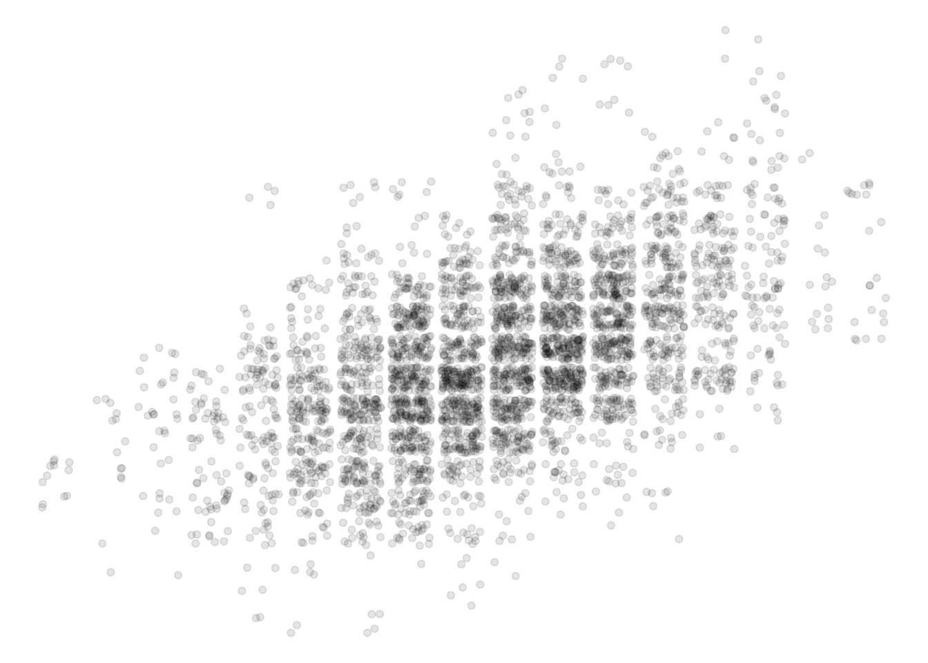You may or may not find this easier to understand than the jittered plots, but it’s a good option to know about. The advantage to this one is that it is a very faithful representation of the original data, so we see the clear “grid” arrangement of points representing the 1-inch increments of our data. But compared to the first scatterplot we made, it’s a lot easier to see that there’s a strong trend in the data, because we can see where points are concentrated much more clearly.