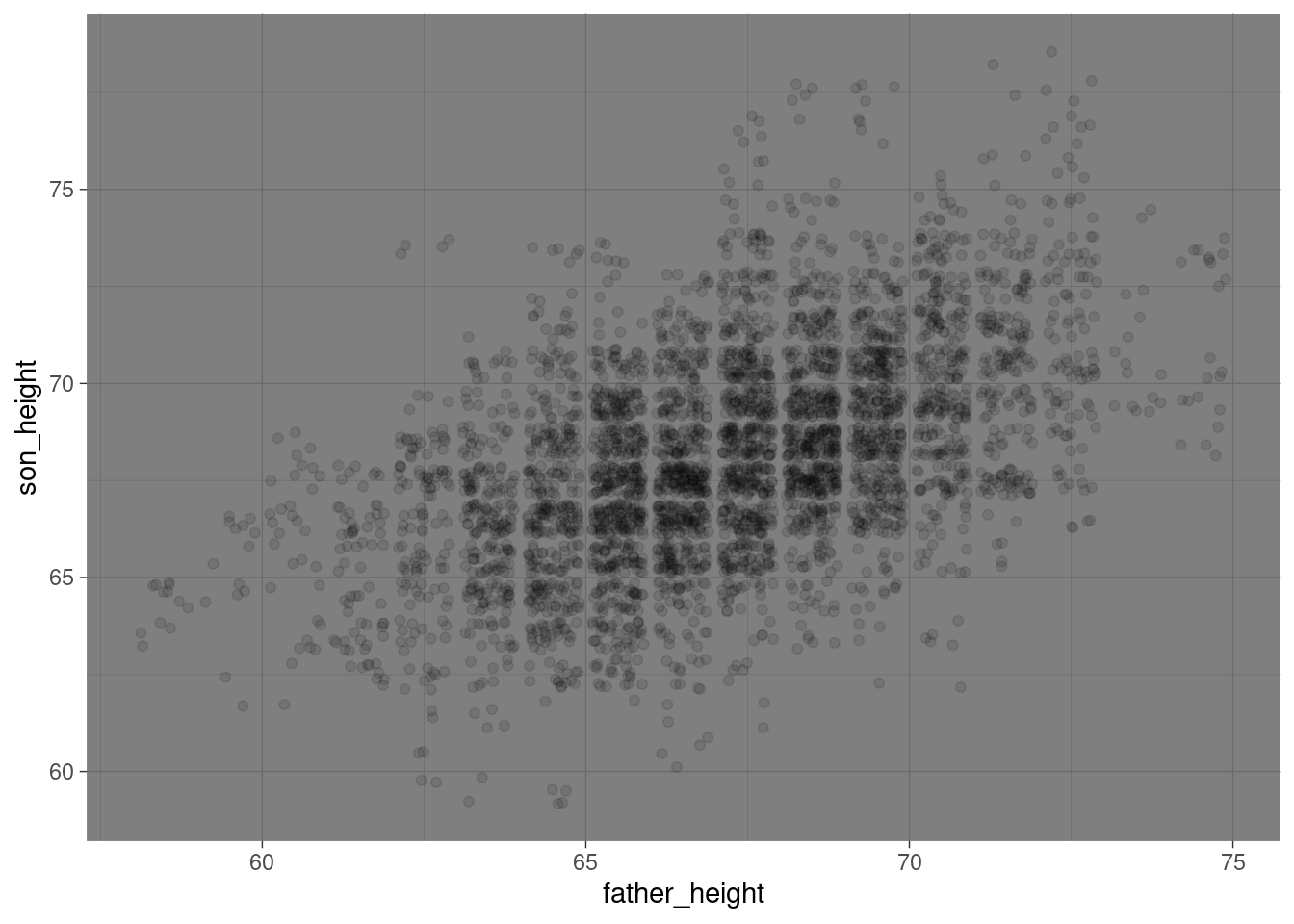 To illustrate, let’s revisit the overplotting issue we are seeing in the graphs so far. Recall that there are many data points that overlap. This is simply because many of the rows of data have essentially the same numbers. For example, there are many rows – which nevertheless represent different father-son pairs – where the value for father_height is 67.5 and the value for son_height is 68.5. So if we plot a dot for each of those rows, they are plotted on top of each other, which is the “overplotting” pattern we are trying to address in the plots above. This is bad because it “hides” a lot of the data from us when we just plot a simple scatterplot without all the tricks like jittering discussed above.