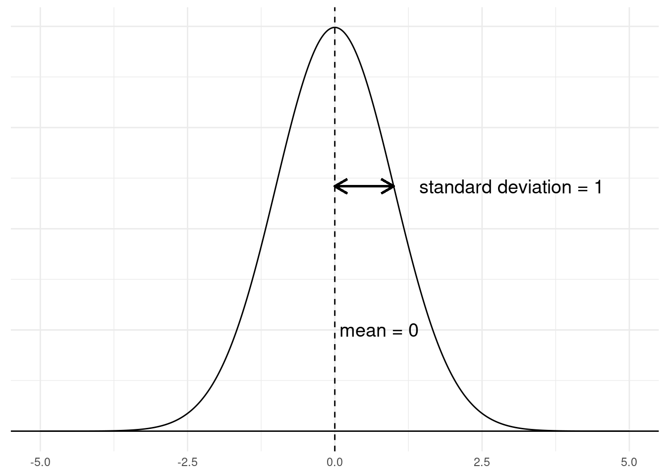 5 There is a horizontal line drawn at \(y = 0\) in the graph, and the density line of the distribution gets so close to it (around +/- 3.7) that it looks like the line goes all the way to zero. But this is just the thickness of the lines in the graph; the distribution never quite reaches zero probability.
