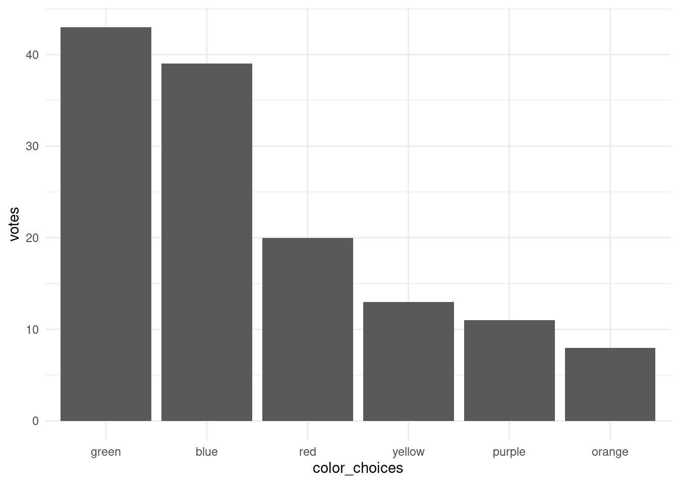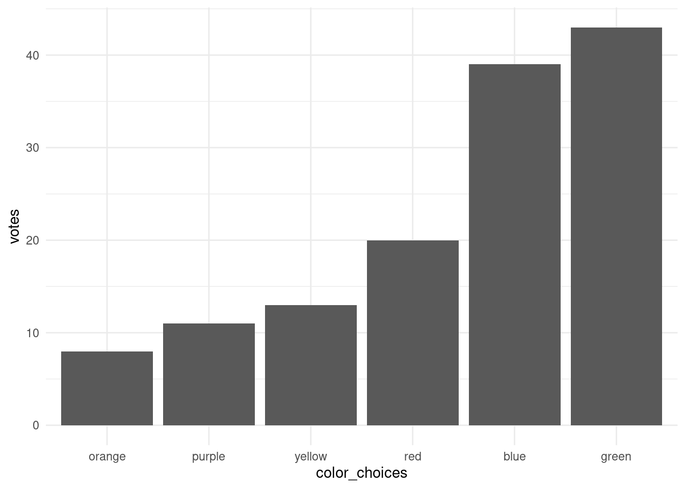 To continue with our hypothetical color survey, we might want our bar chart to be “sorted” in the order of preference, rather than by some other arbitrary order like “rainbow” order. In order to do this, we use the reorder() function, which simply takes a factor (or something able to be coerced into a factor) as the first argument, and then another variable (of the same length) as the second argument, which determines the ranking of the factor levels.