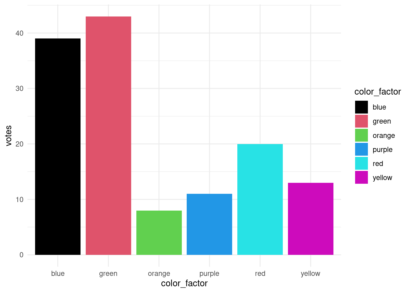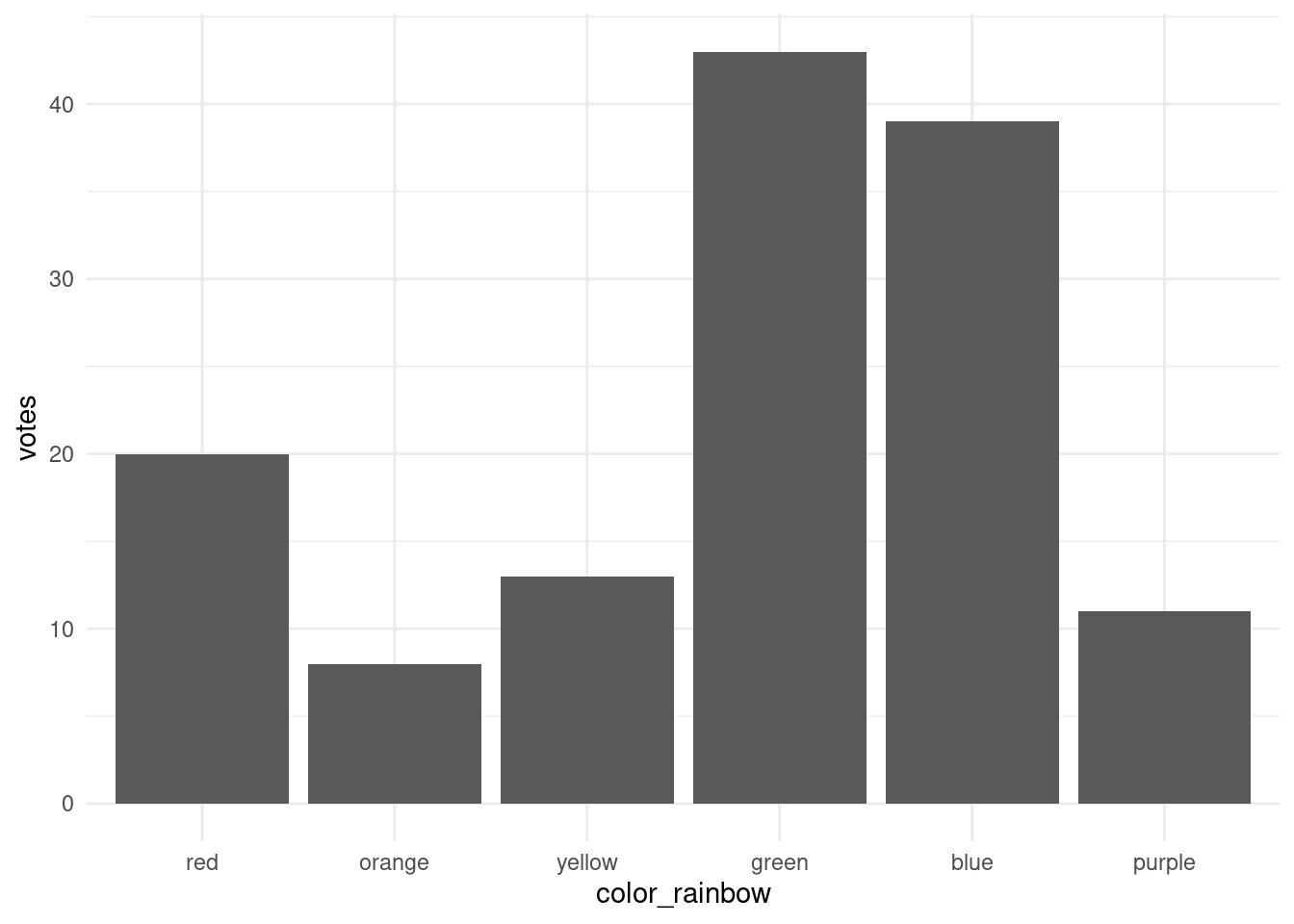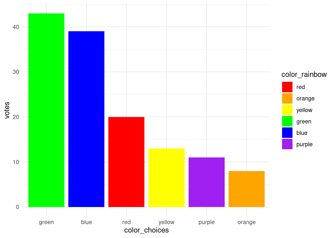 However, one small nitpick” the order of the fill colors in the legend is the same as the order on the x-axis, but maybe we’d like it to be in “rainbow” order. Here’s one last example, showing that you can “mix and match” a bit, where we can use the factor that’s ordered by the number of votes to set the x-axis order, but then use the factor ordered by our manual “rainbow order” to set the order of the fill values.