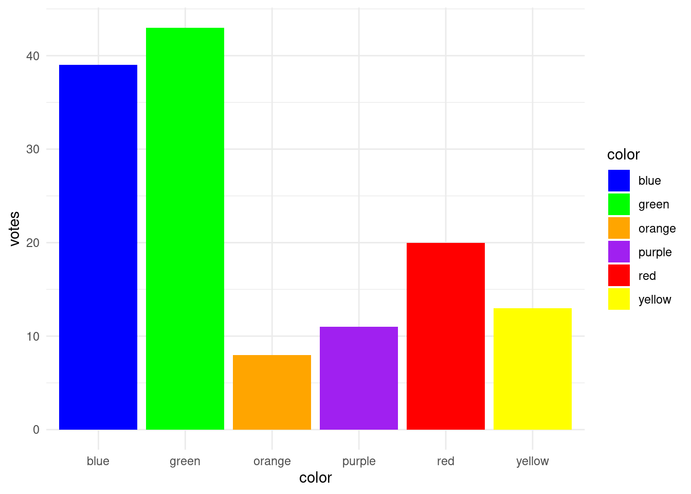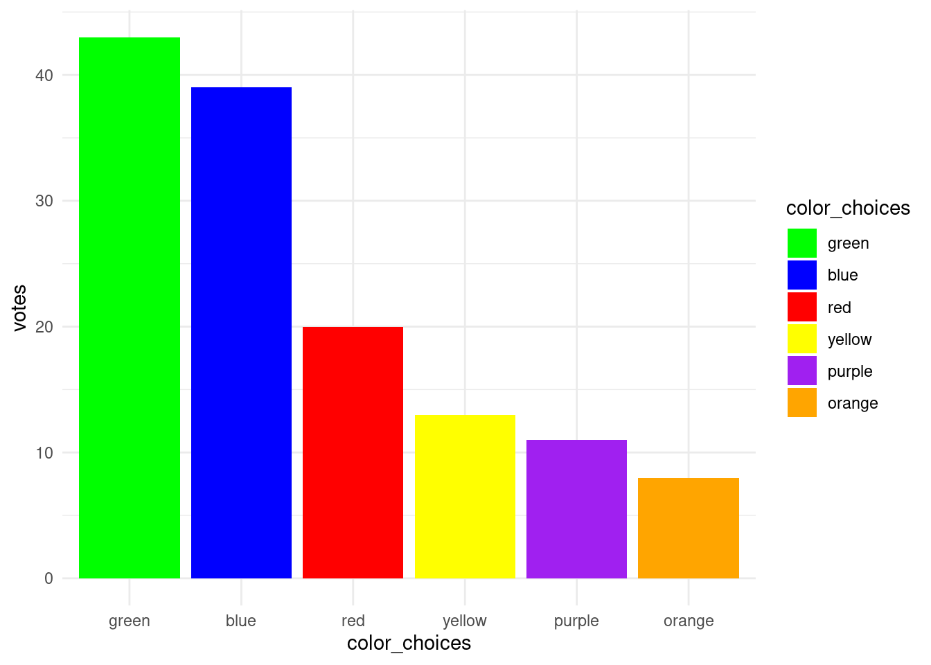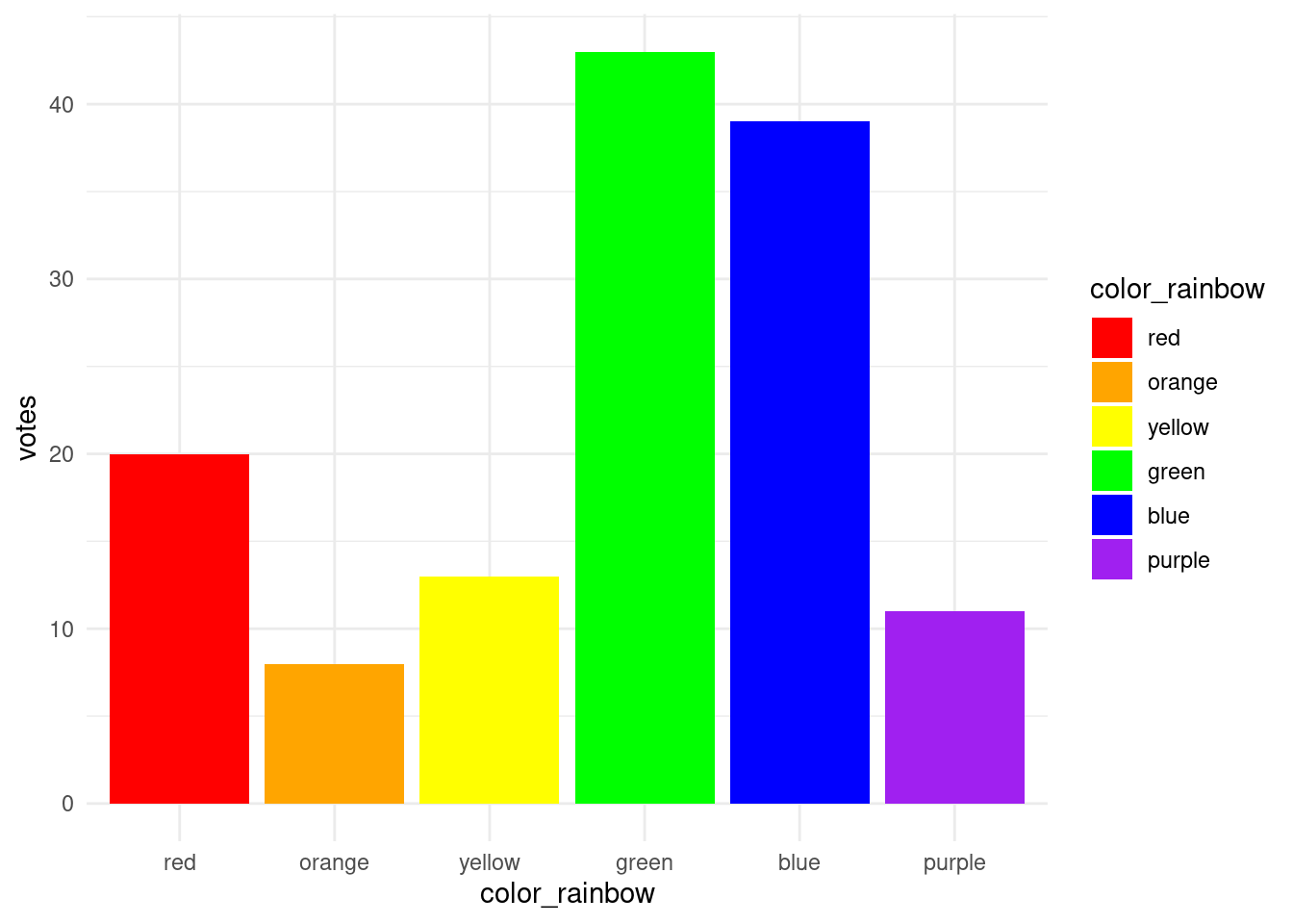 However, one small nitpick” the order of the fill colors in the legend is the same as the order on the x-axis, but maybe we’d like it to be in “rainbow” order. Here’s one last example, showing that you can “mix and match” a bit, where we can use the factor that’s ordered by the number of votes to set the x-axis order, but then use the factor ordered by our manual “rainbow order” to set the order of the fill values.